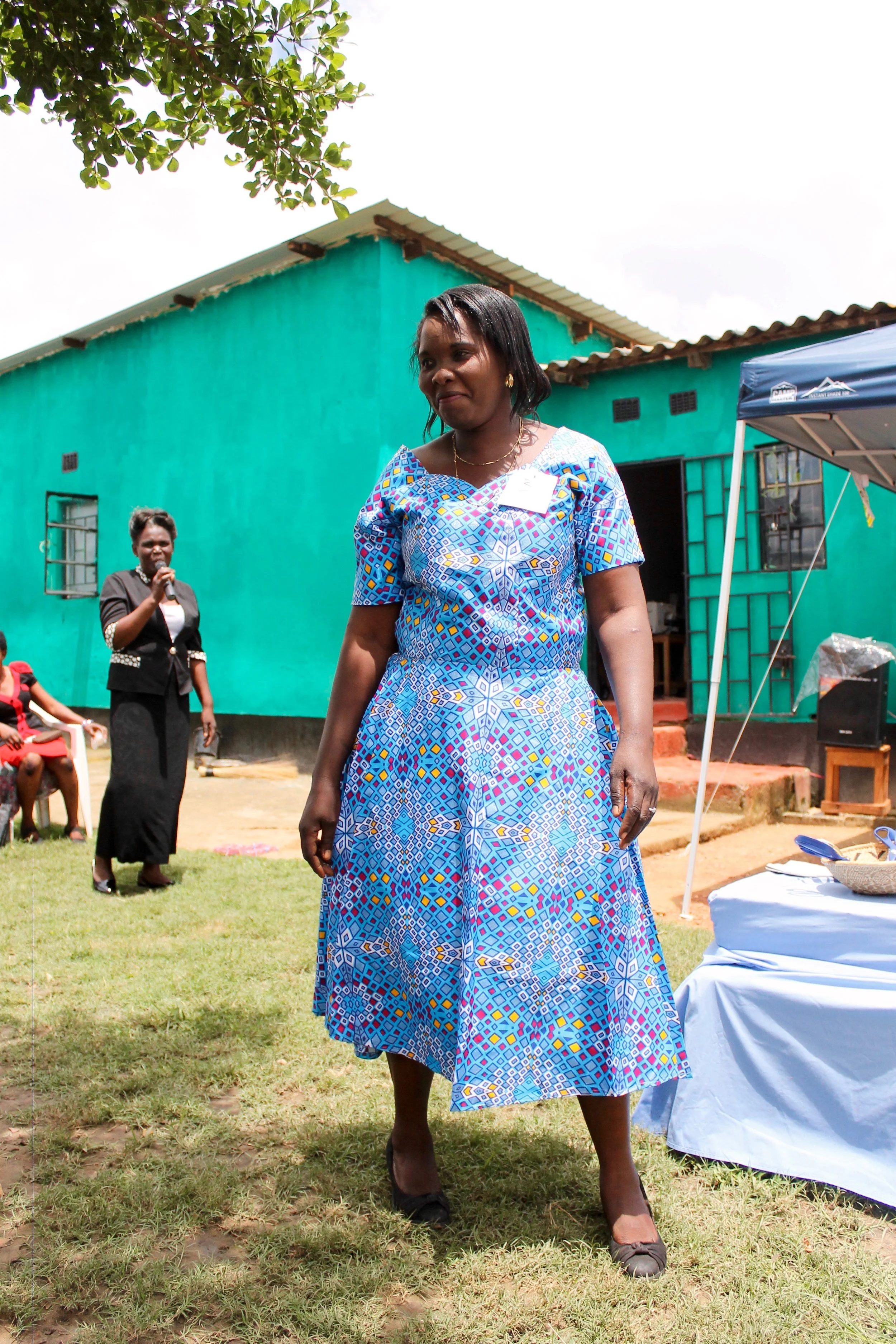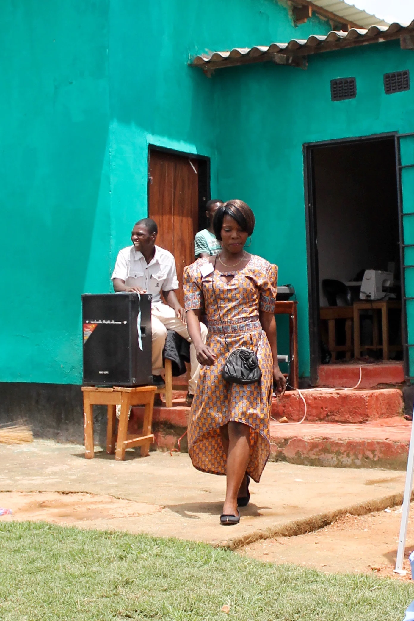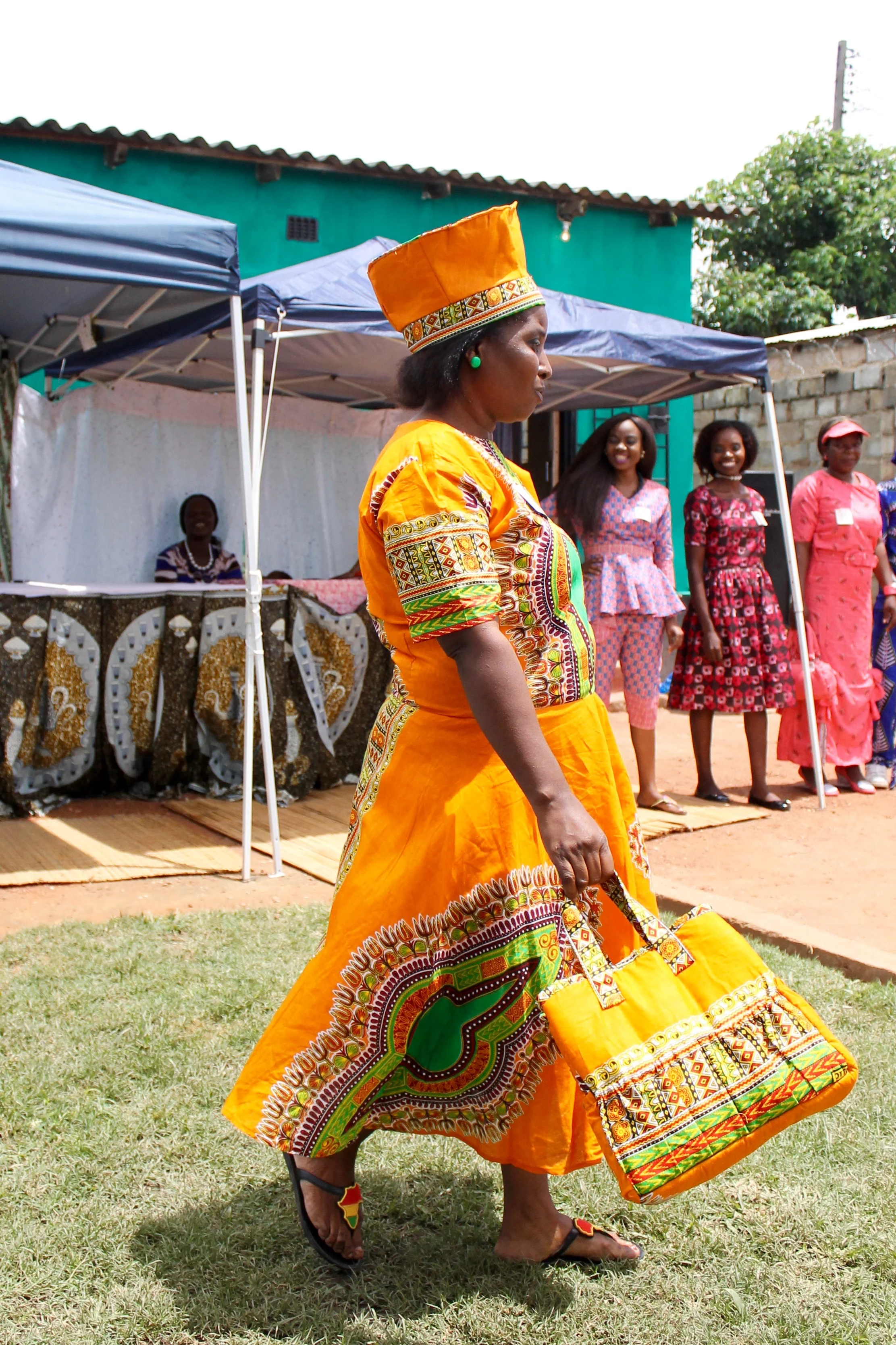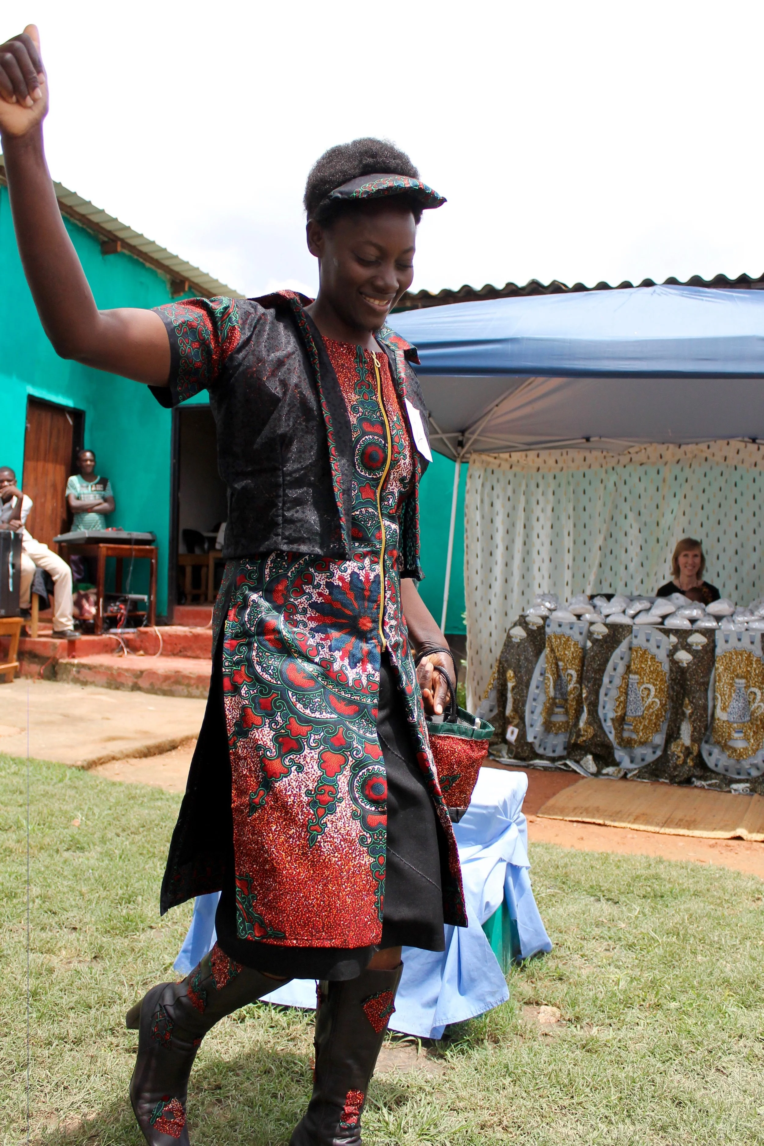 Gladys' head-to-toe ensemble gets quite the reaction from the crowd. Matching purse, a-line dress, and traditional hat in a beautiful traditional chitenge fabric.